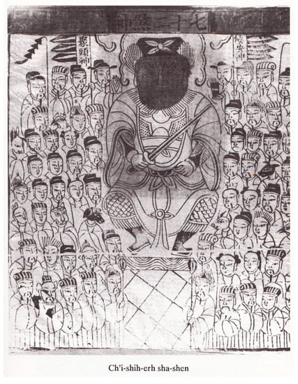 Similar but more detailed descriptions are provided by Anne Goodrich in her book on paper gods, collected in 1931. She says that “there are 72 entrances to the body through which these spirits may enter and cause all sorts of illnesses. […] There are charms to be used against their evil influence.”34 The word “charms” refers to talismanic writing. Most interestingly, she includes a print that shows the 72 Killers as a group of gods (see Figure 2).