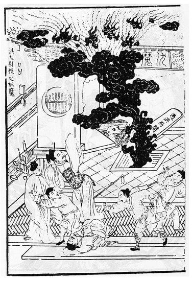 Upon successful completion of the Daoist ritual, the story quickly introduces the demonic subjects that will become the famous outlaws of the story. The imperial envoy that has been sent to the Temple of Upper Purity (上清宮 Shangqing Gong) of the Celestial Masters on Mt. Longhu, led by Defender-in-chief Hong Xin 洪信, is given a tour around the various temples on the sacred mountain. Among the many halls that he visits, one in particular catches his eye: the “Hall for Subduing Demons” (伏魔之殿 Fumo zhi Dian).80 When the envoy inquires as to the meaning of this hall, the abbot answers that it is the hall in which one Celestial Master from the Tang dynasty has “contained and locked up the Demon Kings” (封鎖魔王 Fengsuo Mowang).81 They are locked inside by a “celestial talisman” (天符 tianfu). Hong Xin eagerly demands that he be allowed to take a look at them but the abbot says his ancestral patriarch pronounced a taboo on opening the doors and he would not dare trying. Hong Xin stubbornly insists, accusing the clerics of deceit; he threatens to report back to the throne that Mt. Longhu is populated by a clique of imposters unworthy of the title of Celestial Master, falsely claiming to possess “rituals for subduing demons” (伏魔之法 fumo zhi fa, in some editions “rituals for locking up demons” 鎖魔之法 suomo zhi fa)—with all the possible negative consequences. The abbot yields and accompanies the Defender-in-chief into the Hall for Quelling Demons.