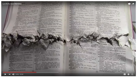 Rutilio Grande, Oscar Romero, and the UCA priests seem to embody the great loss of human lives due to violence in the country. Their stories were crafted as those of martyrs for justice due to their stances against impunity. Thus, the virtual tours give information on 227 massacres documented in El Salvador during the civil war. The video shows the martyrs as part of a larger universe of victims, and highlights the (absurd) violence of the assassins. It is especially evident in the tour created by the Inter American Press Association in 2014, where the narrator talks about a “Bible” destroyed by bullets. The object in question is not a Bible, but a dictionary (Figure 2), and the weapon used to destroy it was a bayonet, but the error is eloquent in that it links the victims’ fundamental beliefs (the Bible) to the way in which their bodies were destroyed (the bullets).6