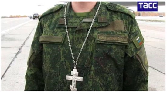 Figure 1). It was a camouflage priest’s cassock, combining the features of vestments and military uniforms. The head of the Department for work with believers of the headquarters of the Central Military District Igor Agafonov commented: “This is a regular uniform of a soldier, the only things that differ are stripes and emblems: There is an Orthodox cross instead of the tabs with the military branch, and there is an additional church rank to the name of a soldier” (