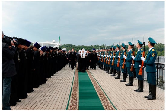 We can observe the Church-army convergence in the representation of military symbolics inside the temple and the emergence of new hybrid forms of sacred military ceremonies. A vivid example is the ceremonial reception of the Patriarch in Plyos in 2015 with the specific guard of honor, where the priests are standing to the Patriarch’s right and military officers are lining up in front of them, thereby forming two symmetrical phalanges (
