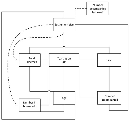 Settlement size seems to be a key variable here, displaying strong correlations with three other variables as well as weaker ones with three more. As noted, small settlements tend to have younger APs but, somewhat contrary to the relationship noted above between time as an AP and number of PIs, these APs have wider networks than average. APs living in smaller settlements tend to live with more people and have fewer illnesses, although given that age is strongly correlated with these variables the fact that they are younger may explain these characteristics.