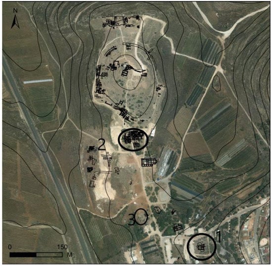 Site Plan: 1: Jamiʿ al-Sitin. 2: Jamiʿ al-Yatim 3. open-air Weli, courtesy of Staff Officer for Archeology—Civil Administration of Judea and Samaria.