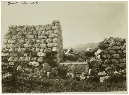 Jamiʿ al-Sitin and the polytheistic burial trough as lintel, from North. From the British Archive SRF_171 (http://www.iaa-archives.org.il/zoom/zoom.aspx?id=43097&folder_id=3380&loc_id=1025) (accessed on 27 September 2020).