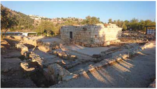 The second structure (Figure 4 and Figure 5) is called Jamiʿ al-Yatim (جامع اليتيم), and it is located immediately at the foot of the Tel, to the south. This name too is unclear. In 1847 John Wilson noted that the place was called “Mazara,” and perhaps this name preserved the custom of the ziyara on-site (). Robinson did not give the name of the destroyed mosque (). In 1873 Charles Wilson described the place as Conrad Schik, called it Jamiʿ a-Daim, translated as “the eternal” (). Three years later Conder wrote that the place was called “Jamiʿ a-Taim,” interpreted as “mosque of God’s servant” (). For more about the mosque and the elements taken from the surrounding churches, such as columns and chancel, see (). Below Jamiʿ al-Yatim two churches were discovered, one on top of the other, which we denote “the northern churches” (). An Ayyubid coin found in the foundation ditch of the mosque may indicate that it was established in that same period ().