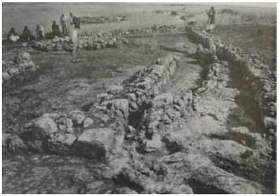 The one structure is called at present Jamiʿ al-Sitin (جامع الستين), and it is the southernmost structure at Shiloh (; ; ; ; ) (Figure 2 and Figure 3). The first researcher to describe the place was Robinson, and he said that it was called the Mosque of Shiloh (). Then Charles Wilson called the place “Jamia el Arbain” (). Clermont-Ganneau insisted that the name was “Jame es Sittin” and explained that the word sittin resembles the word shekhinah [al-Sakina] (). This structure was identified by many researchers as a synagogue (; ; ; ; ). Braslavsky saw the special form of the synagogue as an attempt to emulate the Tabernacle’s animal-skin sheets, and Kier even recognized it as the tomb of Eli. Hans Kjaer noted that according to the local elders it was named thus for the 60 martyrs killed at the site at some period. The lintel of the structure, which in the 19th century was still situated above the doorway, fell down subsequently, reminding these researchers of the lintels of Galilean synagogues. However, Eitan Klein has shown, quite persuasively, that this was not an original lintel intended for a building, rather the side of a burial trough from a burial cave that was secondarily adapted for use as a lintel (). The lintel was stolen from the site by an antiques thief, was found buried in a nearby field, and was subsequently transferred to the Rockefeller Museum (; ).