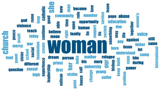 Considering the Voices dictionary, the main focus is on women in the Church and their multiple roles and is shown in Figure 1. The words emerging in the picture are “woman”, “Church”, “she”, and, to a lesser extent, “our”, signaling the overarching theme of the initiative.