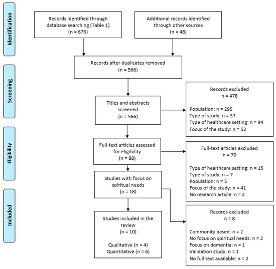 Based on the criteria mentioned above, three stages of selecting and screening articles were performed, as illustrated in Figure 1. In the first stage of screening titles and abstracts, studies were included (n = 88) if the focus of the study was on spirituality, religion or pastoral care. In the second stage of screening, articles were included if the focus of the study was on spiritual needs (n = 18). This means that articles in the second stage were, among others, excluded if the focus of the study (n = 41) was on spiritual well-being (n = 9), religious or spiritual coping (n = 8), interventions (n = 4), religiosity (n = 12) or spirituality (n = 8). The distinction between those two stages was made to maintain a broad scope of views in the first screening and a narrower focus in the second screening. At the final stage, the undecided articles were read carefully and reevaluated. Eight records were excluded due to their focus on community-dwelling older adults (n = 2), due to their lack of focus on spiritual needs (n = 2), due to their focus on people with dementia (n = 1), due to their focus on the validation process (n = 1) or due to their lack of full text (n = 2). Following the PRISMA Flowchart, the selection process resulted in ten studies which are discussed in this review (Moher et al. 2009).