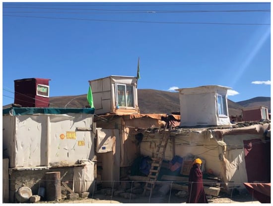 The Yachen Gar monastery has a nomadic character (). The designation “encampment” shows the perceived temporality of the school, as if the nuns and monks are only for the time being making camp at the feet of the master. It also echoes the Buddhist conviction that everything is impermanent. It is precisely because of this nomadic character that it has the potential to thrive, as the only way to subvert the Chinese campaign to transform Tibet in line with Chinese modernization, and to fit this New Tibet into the framework of Chinese nationalism (). This dynamic, interconnected form of homemaking in religion is characteristic for what I have identified as rhizomatic religion. Of course, current destructions of the dwelling grounds signal an attempt by the authorities to control a form of spatial politics on the encampment. In some cases, prefabricated houses were supplied by the Chinese government in negotiation with the monastic authorities to structure the living conditions of the nuns in a way more to the liking of the Chinese authority. Similarly, the ring-road around the encampment already can be seen as a signal of the attempt to curtail the weeding out of the encampment. The nuns themselves, however, appear to be in a state of permanent nomadism—even “leaving home” (出家) at the monastery itself to retreat into the even smaller mediation huts shattered around the hills around the encampment (see Figure 3 and Figure 4). Some have built meditation huts on their already tiny houses (Figure 5).