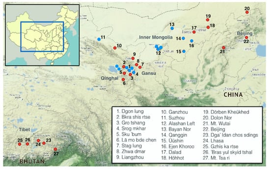Main sites of Sumpa Khenpo’s activities. Blue dots indicate the sites where Sumpa Khenpo performed his rainmaking rituals. Generated by QGIS 2.18 (© Hanung Kim).