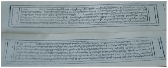 The title of the manual is Kha char ‘beb srung sogs kyi gdams pa gnam sa’i mdzes rgyan, meaning “A beautiful ornament of the heaven and earth: an instruction on summoning and averting snow or rain and other activities.” Although the title of the work indicates that the manual will cover a variety of meteorological-agricultural rituals, a number of aspects indicate that Sumpa Khenpo’s central interest is on rainmaking rituals. In the catalog of his Collected Works, Sumpa Khenpo refers to the same work as an abridged title Rituals of Rain Summoning and Others (Char ‘bebs sogs kyi cho ga), which indicates two facts that, first, Sumpa Khenpo himself puts rainmaking first among others and, second, he considers what he is instructing about is rituals (cho ga) (Sum pa mkhan po [1777] 1975–1979b, folio 9a).36 In Sumpa Khenpo’s Collected Works, this ritual manual is included as the sixth work in volume eight, having 38 folios (75 pages) in the traditional Tibetan book format (see Figure 2). As explained above, this manual of meteorological–agricultural rituals exists as the very last work of his Collected Works, the finale in the progressively sequential order of study subjects for Buddhist practitioners.37