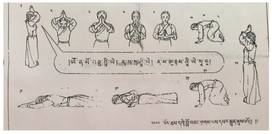 What does a prostration entail? A prostration is the movement of the body from a fully erect position to laying completely prone upon the ground and a return to the standing position. This movement is accompanied by hand motions that place the fingertips together with the thumbs resting in the space between the palms. The hands move up to the crown of the head, down to the throat, down to the heart and then open, palms facing forward as the body moves down to the floor. When down on the ground, the arms go straight above the head, palms flat on the ground, and then move up to the crown of the head with the fingertips pressed together. After rising once again to a standing position, the hands return to the heart-center before beginning the process again. This physical act is performed while reciting the Refuge Prayer quoted above and visualizing the Field of Accumulation (tshogs zhing; See Figure 1) in Amitabha Buddha’s Pureland (bde ba can) (lho rje drung nus ldan rdo rje 2008, pp. 128–33).