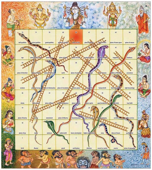 - Masters, James. 2017. Moksha-Patamu (Snakes and Ladders). Available online: http://www.tradgames.org.uk/games/Moksha-Patamu.htm (accessed on 23 July 2019).