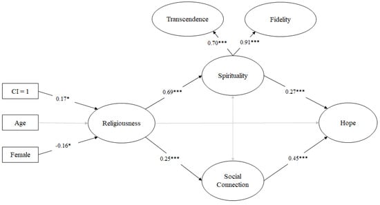 Regarding indirect paths, all hypothesized paths were tested, including the second-order latent variables of spirituality and the latent variable of social connections, in addition to the independent and dependent variables (see Figure 1). In the full model, results indicated that all paths in the hypothesized model were positively significant, except the path from religiousness to HFE and the factor correlation between spirituality and social connections (β = −0.07; β = 0.12, p > 0.10, respectively). We found that the relationship between religiousness and HFE covaried through spirituality and social connections (Figure 2). In other words, religiousness promoted youth’s spirituality and social connections, which in turn, positively influenced HFE. The model revealed significant total indirect effects between religiousness and hope (β = 0.30, p < 0.001) via spirituality (β = 0.19, p < 0.001), and via social connections (β = 0.11, p < 0.001).