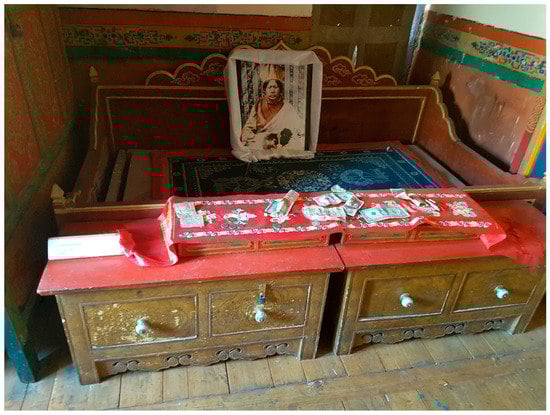 In the Buddhist monastery, the entire compound—including the museum—is consecrated, and ceremonies asking permission from the guardian deities of the soil may be necessary before a new museum building can be opened. All monastery museums require visitors to remove their shoes before they enter as a sign of respect, just as in the temples themselves.30 As museums are an integral part of the sacred space of the monastery, visitors can worship within them. In Hemis monastery museum, for example, incense is lit every morning to purify the space before the building is accessed by the public; incense was used too in the old Chemde monastery museum. In the latter, monks performed a specific ritual each morning in the room dedicated to the founder of the monastery, Taktsang Repa (stag tshang ras pa, 1574–1651). It is notable that local visitors move around the exhibition rooms in this building, regardless of the layout of the cases, in a clock-wise direction, undertaking a ritual, known as a ‘kora’ (skor ra)—a circumambulation performed by walking clockwise (usually around a stupa or mountain) as part of a ritual Buddhist practice. Many visitors at Chemde were observed by the authors stopping off for prayer as they processed around the displays, bowing their heads, hands held together at chest level, murmuring in front of particularly potent images. Offerings of money were left in front of certain deity statues in the museum, on Taktsang Repa’s couch, and a white silk scarf (kha btags) was placed as a sign of respect and reverence over the framed photograph of a reincarnation of Taktsang Repa (Figure 10).