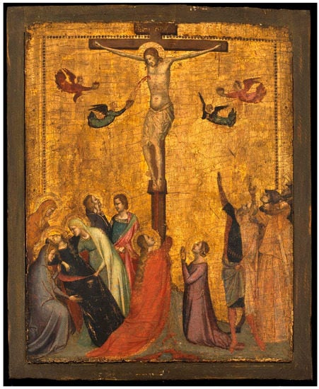 (Close follower of) Bernardo Daddi, Crucifixion with kneeling donor, c.1320, wooden panel, probably part of a diptych, 40 × 28.5 cm. Boston, Museum of Fine Arts, 23.11.