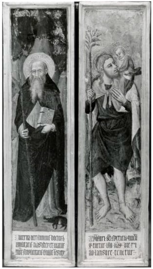 The folding triptych in the Walters Art Gallery, Baltimore, also shows male and female donor figures (Figure 5). The central panel shows the Coronation of the Virgin with, below the Virgin, St Anthony presenting a male donor and, on the other side, below Christ, a male bearded saint (probably St Christopher) presenting a female donor figure. On the side panels are SS Nicholas and Peter, Paul and Catherine of Alexandria. Anthony Abbot was popularly invoked against not only St Anthony’s fire, but a wide range of other illnesses and, in particular, the plague. On the exterior sides of the panel are SS Anthony Abbot and Christopher, with inscriptions indicating their patronal functions: ‘Lucerna veri luminis, doctor humilitatis, magister et viator mirae sinplicatatis; refulsit in Egitto’ (‘A lamp of the true light, a teacher of humility, a master and traveller of admirable moral simplicity; he shone in Egypt’) and ‘Xpofori sancti spetiem quicumque tuetur, illo namque die nullo languore tenetur’ (Whoever looks at the image of St Christopher will not be taken by any illness during that day’) (Figure 6) ().