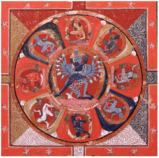 A similar pattern occurs in the Caṇḍamahāroṣaṇa Tantra. The Caṇḍamahāroṣaṇa Tantra is a comparatively late Yoginī tantra composed centuries after the Hevajra Tantra, probably in late 13th century Nepal.44 The relevant Apabhraṃśa passages in this text occur in the fourth chapter, the “deity” chapter. Here, the Buddha Caṇḍamahāroṣaṇa describes the maṇḍala ritual, and how, after having visualized oneself as Caṇḍamahāroṣaṇa (Figure 2), one should visualize eight yoginīs surrounding him. Then, after “[inviting] the coming forth of Wisdom,” four yoginīs call out to him in song:45
