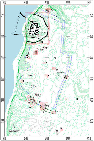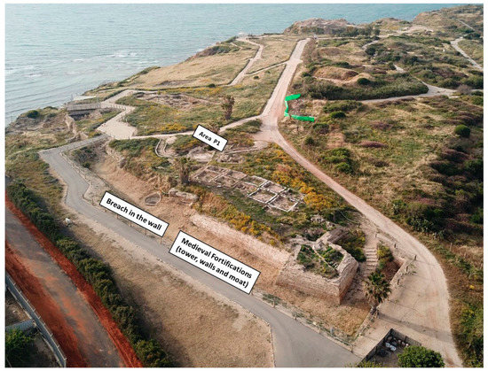 | 15 | Area P’s main discovery was a formidable platform built into earlier strata and dated to the end of the Crusader period, assumed to have served Crusader artillery; see in this respect, (Tal and Roll 2011, pp. 37–38) in the English section). As the walled medieval town site forms part of the Apollonia National Park (as of 2001), originally the architects of the park planned a bridge across the medieval town southern fortifications moat on which a pathway for the disabled will serve the entrance into the walled town. Thus, the preliminary excavations on both sides of the moat (in Area P1 and Area P2) were carried out in 2012 in the context of this bridge foundations. It may be added that Area P1’s upper level is mostly characterized by thick white mortar surfaces (to facilitate Crusader maneuvering), in which many thirteenth-century arrowheads were found, similar to those unearthed in the Crusader castle, attesting to the fierce fight with the Mamluks (on the latter, see Ashkenazi et al. 2013). Area P2 revealed no substantial findings apart from the moat’s external (southern) fortification wall. |