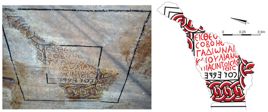 The mosaic was uncovered in the hall’s southern half with the inscription close to its center. It is rectangular, and double-framed with black tesserae (reconstructed dimensions are 1.3 × 1.4 m). It is aligned in an east-west orientation, that is, the person reading it would face east toward Mount Gerizim. Surrounding the single black frame around the inscription itself is a partially preserved tri-color (black, red, and white) guilloche-patterned frame (Figure 5 and Figure 6).17 It seems that the double-framed rectangular panel with the inscription in its center and the surrounding guilloche were encircled by a round medallion, of which only a small part has survived on the west. Our measurements show that neither the double-framed black rectangular panel nor the lines of the inscription are totally aligned; hence, we cannot exclude the possibility that parts of the mosaic pavement have slightly moved over the years. Moreover, small parts of the inscription were extracted from the floor in later periods and over time it was covered by whitewash that accumulated on the floor (unconnected to the later plastering). Nonetheless, the inscription itself was found to be almost complete.