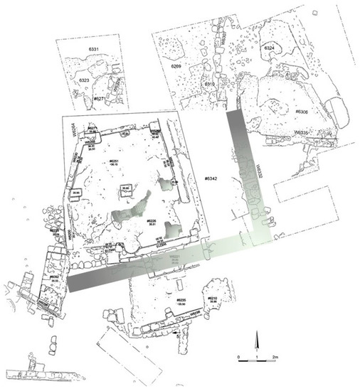 With these comparanda in mind, we came back to the field in the summer of 2015 in order to find remains of a synagogue building around the inscription we have unearthed in 2014. We have extended the area of excavations to the north and west, and the total extent of Area P1 was now some 18 × 15.5 m, whereas the 2015 extension included some five (4 × 4 m) squares. The overall preservation of the archeological remains in the area was relatively poor, as the three northernmost and the three easternmost squares were right beneath an area that was occupied up until 2001 by an Israel Military Industries plant. These squares were located right beneath the plant driveway, an electric transformer and a fence. As such, these squares were found disturbed and clean of any secured archeological remains in the elevation we have reached. Still, other parts of the newly opened squares were mostly dominated by plaster floors (and floor foundations) that originally served plastered installations (e.g., F6271, F6306) delimited by fragmentary walls (e.g., W6329, W6335) (Figure 2) dated to the Early Islamic period.