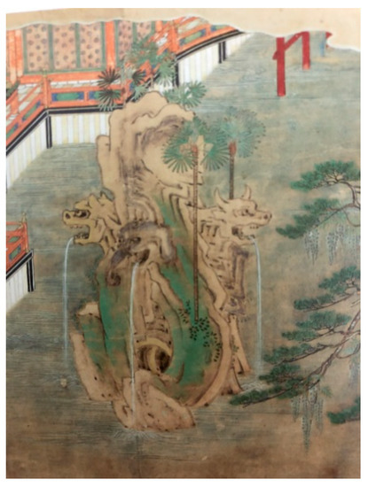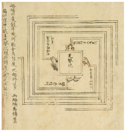 In Buddhist cosmology, a large lake called the Anavatapta Lake (Ch. anouda 阿耨池, anoudada 阿耨達池; Jp. munecchi 無熱池) lies at the center of the continent Jambudvīpa, the southern of the Four Continents surrounding Mt. Sumeru. This cosmology was transmitted from India to East Asia along with Buddhism. The Anavatapta Lake occupies an important place in this cosmology because it is the source of all water and therefore crucial to all life. The lake is the sacred abode of a water deity dragon, Nāga, and rivers run from the lake in all the cardinal directions―to China in the east, to India in the south, to nomadic lands in the north, and to the Middle East and Europe in the west―bringing water to everywhere in Jambudvīpa. The significance of the lake derives from this myth, that the water from the lake nourishes all creatures in the world.