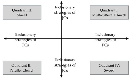 Foregrounding the episteme of Wacquant’s (2012) logic of inclusion/exclusion in the Cartesian plane, the y axis would refer to the exclusionary/inclusionary tendency/attitude of the JCs as the host group while the x axis would relate to the FCs’. Positive integers refer to inclusionary acts as the negative numbers to exclusionary acts. Quadrant I (+,+) is named “Multicultural Church” which encapsulates the vision of the Church of Japan in relation to its call for the integration of various ethnic church communities. Quadrant II (−,+) refers to the “Shield” which highlights the exclusionary tendency of FCs despite the inclusive initiative of the host JCs. Quadrant III (−,−) speaks of the “Parallel Church” imagery where both the JCs and FCs mutually resort to exclude one another and prioritize one’s own ethnic group’s being. Quadrant IV (+,−) is the “Sword” where the emphasis is more on the constraining and restricting tendency of the host group than the attempt of the migrant group to belong and be recognized. To better visualize this reappropriated Cartesian plane, see Figure 2 below.