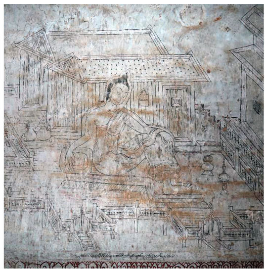 Figure 4). Next, the Tathāgata is shown seated inside the jeweled house created by the gods. The depiction, of course, tallies with its caption: “Meditating in tranquility at the golden Yadanar Gara jewel house for seven days”. This is thus the Fourth Week (see