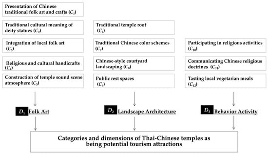 In this study, inductive coding commenced in close reading of the text and multiple inherent meanings. The researcher then identified text segments that contained meaning units, and created a label for a new category to which the text segments were assigned. Additional text segments were added to the category where relevant. During the analysis, the researchers provided a preliminary description of the meaning of each category, such as association, connection, and meaning, and wrote a memo on each of these categories. Each category was revised and improved through continuous comparative analysis by searching for new concepts and contradictory viewpoints. Categories were combined or connected under a higher-level category when their meanings were identical. In this study, 25 initial categories were extracted and encoded in the verbatim transcripts of the respondents’ interviews. After eliminating overlapping and redundant instances, 12 main categories were created. Further, after organizing the relationship between these categories, these 12 categories were classified into three different dimensions. Therefore, the results of the qualitative research stage in this study show that the various constituent factors of the cultural tourism attraction of Thai-Chinese temples constitute a hierarchical structural system (Figure 2).
