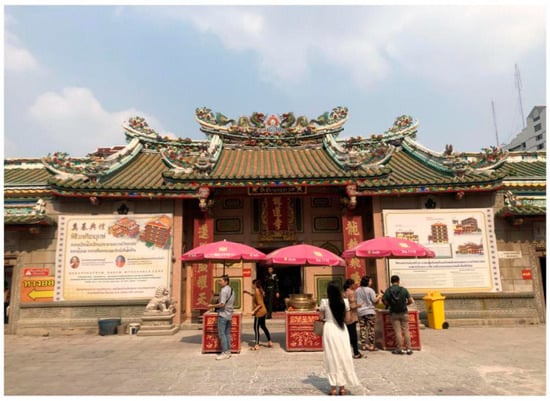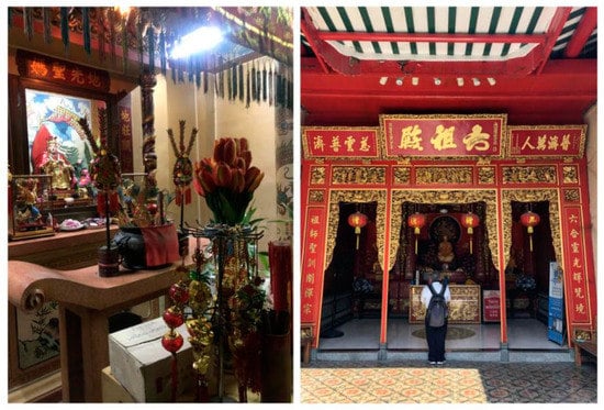 Chinese religious beliefs in Southeast Asia were formed during the historical emigration of the Chinese to Southeast Asian countries and on the basis of the changes in their living environments (Zhong and Zhang 2011). Previous studies reveal that the traditional religious beliefs that have prevailed in Fujian and Guangdong mainly originated from Taoism, Buddhism, and Confucianism and derive from several forms and contents of folk beliefs (Eng and Lin 2002; Xue and Zhu 2008; Junkui 2017). The traditional religious beliefs of the Southeast Asian Chinese originated from it and formed similar harmonious beliefs (Zhang 1999). The migration of early Chinese immigrants brought traditional temple architecture and practices. For them, temples were places of worship and performing social rituals such as promoting solidarity, conducting welfare activities, and gathering for funerals (Hsiao et al. 2005). For example, Cheng Hoon Teng Temple, the first Chinese guild hall in Malacca, Malaysia, influenced the evolution of the Fujian guild hall. When Chinese immigrants arrived in Singapore from the southeast coast of China, they built temples for their own communities. Most of these temples were established by the five dialect groups, namely, Min, Yue, Chao, Ke, and Qiong (Chen 2009).