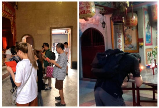 There are three main categories under behavioral activity (D3), namely, participating in religious activities (C10), communicating Chinese religious doctrines (C11), and tasting local vegetarian meals (C12). Religious activities can also be enticing for nonreligious tourists. Many respondents said that they visited the temples not out of devotion to corresponding religious beliefs but due to the strong sense of novelty and mystery surrounding these religious spaces (Figure 5). Thai-Chinese temples embody the religious beliefs of Chinese immigrants. These unique religious activities attract tourists’ attention and invoke a feeling of curiosity.