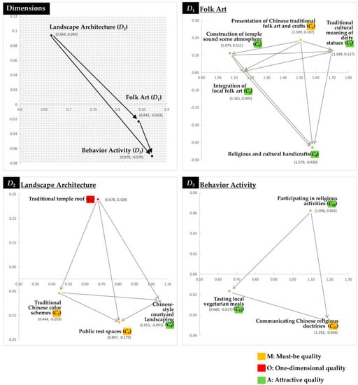 Tzeng and Shen (Tzeng and Shen 2017) posit that when developing improvement strategies for a particular project, the complex relationships among factor categories must be clarified. Therefore, this study distributed questionnaires to experts and used DEMATEL technology to clarify the dominant influence relationships among the 12 main factor categories. Then, the INRM was plotted according to the results of DEMATEL analysis (shown in Figure 6). The dominant influence of each dimension is as follows: D2 > D1 > D3. This means that when formulating strategies to enhance the cultural tourism attraction of Chinese temples, decision makers should seriously consider the evaluation of the temple’s landscape architecture quality. Chinese temples value the integration between different forms of traditional Chinese folk art (D1), including sculpture and painting as well as religious music and local folk art symbols. These can have an impact on tourists’ behavioral activities in the temples (D3).