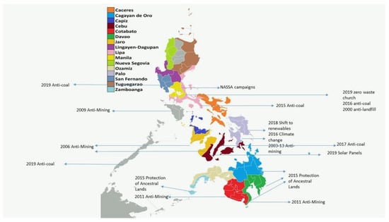 The ill-effects of large-scale extractive mining on the environment cannot be overstated enough. Large-scale mining in the Philippines has devastated entire forests, leveled off mountains, and polluted rivers and lakes with mine tailings and chemical wastes. Moreover, these activities were taking place in poor communities where several ethnolinguistic groups live. Figure 1 is a map of environmental campaigns as concrete responses to the CBCP pastoral letters on the environment.