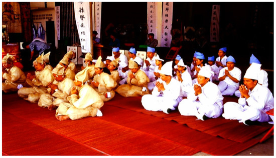 Thailand is the country of Southeast Asia of which the citizens of Chinese ancestry are the largest in number1 and among the best socially integrated, to the point of controlling, at the turn of the twenty-first century, both the domestic economy and the local political sphere. However, from 1932 to the late 1950s, Thai nationalist rulers imposed on immigrants a strong assimilationist policy, which resulted in a loss of Chinese language and culture among their descendants. As a consequence, officiants able to conduct death rituals are locally few in number and for most of them perform in charitable associations, known as shàntáng (“halls for good deeds”, 善堂). These organizations, which developed in China during the nineteenth century (Rowe 1984, p. 248; Naquin 2000, pp. 653–69), and blossomed in Southeast Asia from the turn of the twentieth century onwards, offer services of various kinds in Thailand. They provide material assistance to the poor and emergency relief for victims of fire, flood and other disasters. Their rescue teams equipped with ambulances intervene in traffic accidents to administer first aid to the injured while moving them to the hospital, or to transport the dead to the mortuary. The richest of them manage hospitals of their own, and apply not only first aid, but also health care to casualties. Their charitable activities being closely linked to the combined worship of Buddhist saints and Immortals of the Daoist pantheon, the shàntáng are also the main source of specifically Chinese religious activity in the Thai context. They train new generations of priests and serve as rallying points for great annual celebrations. They also manage cemeteries and provide the necessary know-how to arrange funerals true to the traditional pattern.