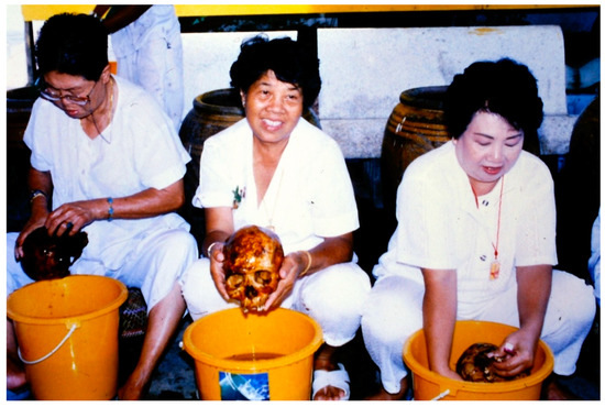 Déjiāo bones’ gatherers washing skulls during a xiū gūgú, Roeit, Thailand, 1994 (© B. Formoso).
