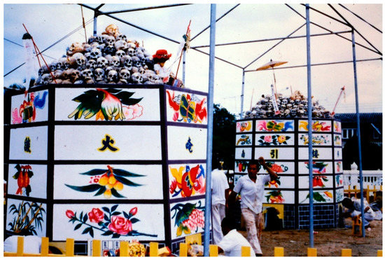 The next day, in the afternoon, disposal rites take place. The comparison of their performance in Chaozhou and Thailand confirms the remark of R. S. Watson (1988, p. 205), that the guideline of this category of rites is more flexible and subject to political manipulation than funeral rites. In Chaozhou, once dried the skeletons are put into jars allegorically called huájīn 华金 (blossoming gold), to express an auspicious transfer of the dead to the underworld and a desirable prospective rebirth. To this end, the disposal of remains in the jars is believed to reproduce the fetal position. In Thailand, due to the injunctions of the monarchy for the festival to respect Thai death rituals, Déjiāo and the other local shàntáng, have inserted a new sequence before the burial of the remains in the “Mother Mountain” grave, namely cremation. For that purpose they do not use jars anymore but cotton bags. Firstly, the bones are transported by means of these containers to the place of cremation. In this place, the bones are extracted from the bags and are piled up according to their gender into two large chimney pyres (seen in Figure 4), called by means of Buddhist metaphors, “treasure pagoda” (băotă 宝塔) for males and “lotus pond” (liánhuā chí 莲花池) for females. These chimneys may be seen as collective jars because the bones are laid inside so that they form a single megacorpse, with the bones of the feet and legs at the bottom, those of the trunk and arms occupying the intermediate position, and the skulls arranged to form a pyramid at the top. The symbolism of a well-ordered social body is then preserved in a vertical rather than horizontal way. Two other features characterize the layout: an umbrella, emblem of the Siamese king, overhangs the skulls of the rulers at the top of the pyramid; and if remains of a monk have been identified, they are draped with a monastic gown and set at the apex to represent the overwhelming spiritual power of the Buddha.