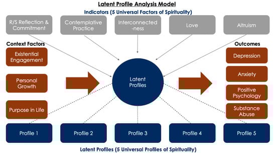 The raw data were analyzed using SPSS 22.0 (SPSS I 2011) and Mplus 7.0 (Muthén and Muthén 2012). First, a series of inductive Exploratory Factor Analysis (EFA) and cross-validating Exploratory Structural Equation Modeling (ESEM) were conducted. The specific methodology of factor structure creation and factor loadings can be found in the Frontiers in Psychology article by McClintock, Lau, and Miller (McClintock et al. 2016). The factor scores in five continuous dimensions of spirituality (i.e., spiritual reflection and commitment, contemplative practice, unifying interconnectedness, love, and altruism) produced by the ESEM were then used as continuous cluster indicators to conduct a Latent Profile Analysis (LPA). LPA is a form of mixture modeling, which determines the degree to which there are subgroups, or in the present study—phenotypic subtypes—in a heterogeneous sample (Jung and Wickrama 2008; Muthén 2002). In other words, LPA uses a bottom-up, data-driven approach to identify groups of people in a sample based on how they answer survey questions (i.e., grouping people who have similar patterns of behavior, traits, etc.). The following is a practical example of how LPA might be used: we obtain survey data on drinking behavior (e.g., how often do you drink socially, how often do you drink alone, how much does drinking hinder work and relationships), and the LPA identifies several subgroups of alcoholism based on how people answer these questions (alcoholic, social drinker, abstinent). Latent profiles in the present study were derived from the LPA, which represent distinct homogeneous subgroups in the sample. After running an initial LPA without covariates, we found residual variance that was not explained by the model. As a result, we included an overall latent factor as an internal covariate to account for the portion of the variance unexplained by the latent factor. Furthermore, we included country as a covariate in the model to influence the mass probability of belonging to a certain profile. In essence, when determining phenotypic profile classification, the model adjusted for differences in the variables of country and the latent factor of the indicator variables. After a model of best fit was established, we utilized the estimated posterior probabilities of profile membership to conduct a series of multiple linear regression and logistic regression analyses to predict distal outcomes, including rates of depression, anxiety, substance-related disorders, and positive psychology.