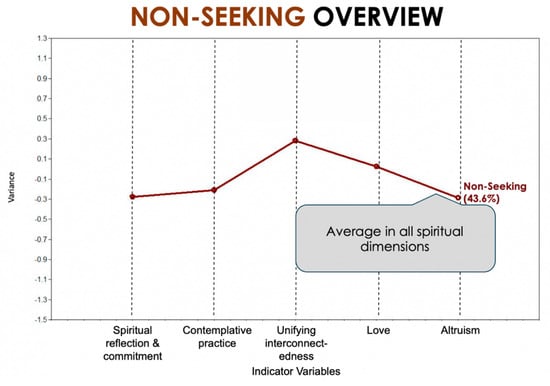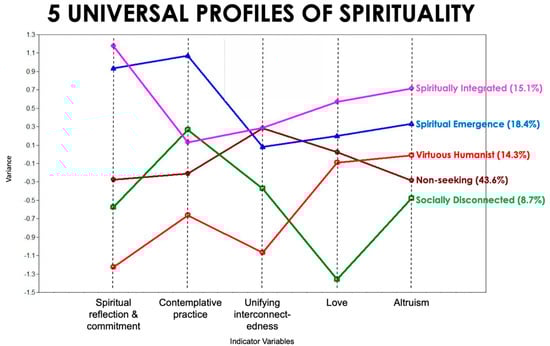 The five profiles (Figure 2) were named as follows: virtuous humanist, spiritual emergence, socially disconnected, spiritually integrated, and non-seeking. The virtuous humanist profile (profile 1, Figure 3) comprised 14.3% of the sample and exhibited low levels of spiritual reflection and commitment, contemplative practice, and interconnectedness and slightly above average levels of love and altruism. The spiritual emergence profile (profile 2, Figure 4) consisted of 18.4% of the sample and manifested high levels of spiritual reflection and commitment and contemplative practice, average levels of interconnectedness and love, and slightly above average rate of altruism. The socially disconnected profile (profile 3, Figure 5) comprised 8.7% of the sample and exhibited low levels of spiritual reflection and commitment, interconnectedness, and altruism, slightly above average rate of contemplative practice, and a very low rate of love. The spiritually integrated profile (profile 4, Figure 6) consisted of 15.1% of the sample and displayed a very high rate of spiritual reflection and commitment, slightly above average levels of contemplative practice and interconnectedness, and high levels of love and altruism. The non-seeking profile (profile 5, Figure 7) consisted of 43.6% of the sample and reflected those slightly below average on spiritual reflection and commitment, contemplative practice, and altruism, average on love, and slightly above average on interconnectedness.