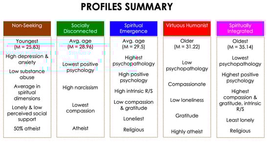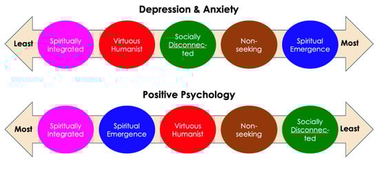 In order to examine variance in the mid-section of the measures, we subsequently conducted a series of multiple linear regression analyses. As the substance disorder measures were obtained as binary scales, they were excluded from these analyses. The conditional probabilities of the profiles significantly predicted depression, anxiety, and positive psychology (F(4 5325) = 82.75, p < 0.001; F(4 5341) = 45.09, p < 0.001; F(4 5014) = 122.28, p < 0.001). Moreover, the conditional probability of each profile differed from one another in predicting rate of depression (Table 6; Figure 8). Those who had a higher conditional probability of belonging to the spiritually integrated profile had significantly reduced risk of depression and greater rate of positive psychology compared with all other profiles. Those who had a higher conditional probability of belonging to the spiritually integrated and the virtuous humanist profiles exhibited reduced risk of anxiety compared with other profiles. In contrast, those more likely to be in the spiritual emergence profile displayed a dichotomy in mental health outcomes—the highest rates of depression and anxiety and second to highest rate of positive psychology. A summary of the profiles is displayed in Figure 9.