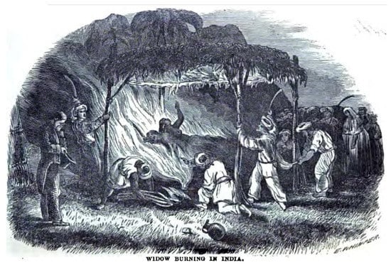 ‘Widow Burning in India’; illustration by the Wesleyan Missionary Society (a public domain image, https://archive.org/downloads/wesleyanjuvenil08socigoog/wesleyanjuvenil08socigoog.pdf).