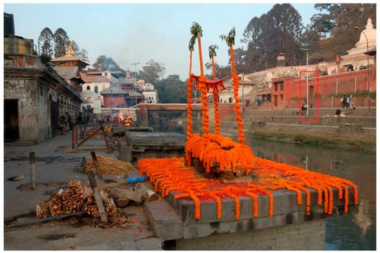 Paśupatināth cremation ghāṭs, Deopatan, Nepal, with ‘Satīdvāra’ (the historical satīs’ gate) indicated in red (photograph courtesy of Purushotam Khatiwada, Kathmandu).