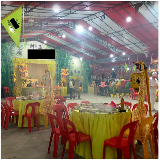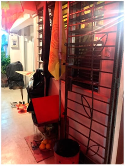 To the uninitiated, a sintua may look like any typical HDB flat, apart from perhaps some religious paraphernalia or banners and tablets (with the name of the sintua) placed outside the flat to indicate that the flat is a sintua. Some sintuas may also place a black command flag (or orh leng, the Hokkien term for 黑令) emblazoned with the Taoist eight trigrams outside the flat (see Figure 1). According to Chan (2006), the black command flag represents the celestial army attached to the main deity of the temple, and its presence is a strong indicator that a tangki operates within. Scholars have characterised tangkis as associated with “Shenism”, which refers to the practice of worshipping spirits or “shen” (拜神) (Elliot 1955); “Chinese religion”, which refers to a hybrid and syncretic blend of Taoism, Buddhism, and Confucianism (Dean 2019; DeBernardi 2006), as well as Chinese folk religion (Chan 2006). As Heng (2016) puts it, “spirit mediums are bricoleurs that may have unique variations to their practices, but nonetheless are part of a widely shared cosmology and theodicy” (DeBernardi 2006, p. 9; Heng 2016, p. 222).
