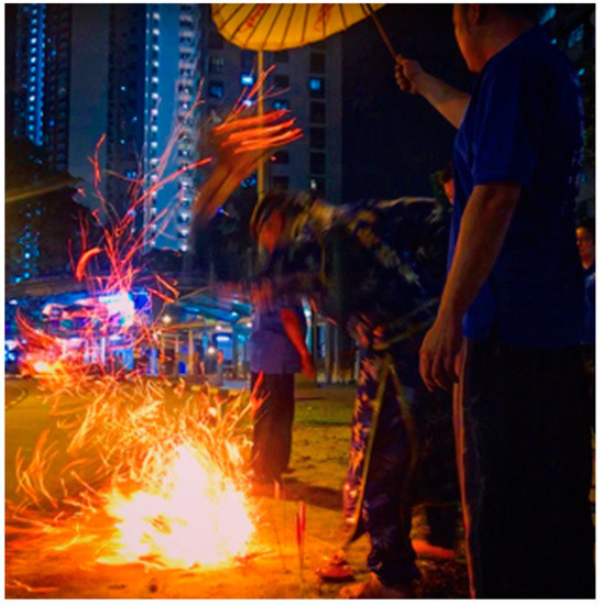 However, besides appropriating the physical space of a footpath, questions about what other “appropriations” are made in such instances could also be raised. In her study on house churches in Singapore, for instance, Kong (2002) argues that the appropriation of the state’s ideological values—e.g., “family”, as the basic building block of society and “community before self”—by religious groups served as a useful strategy for them to avoid relocation and maintain a sacred space, in the context of a secular state (Kong 2002). In this case, it is interesting to note that, while the gathering of deities is undoubtedly a religious one, the activity also has strong non-religious overtones of “community building”, as demonstrated by the maintaining of community ties between the two sintuas. Borrowing from Chan’s (2006) idea of tangki worship as “communal theatre”, aspects of community building can also be seen from devotees who had gathered round to observe this religious merriment. As Chan (2006) argues, “tangki events bring people together, binding them with group identity and purpose. People derive social position from participation in such activities, whether mediums, ritual assistants or devotees” (Chan 2006, p. 114). Thus, future research could potentially look into whether, and how, such overtones of “community building” resonate with another dominant state narrative—the role of public spaces as communal spaces to promote conviviality among people—as well as the implications on the concept of “sacred space”.