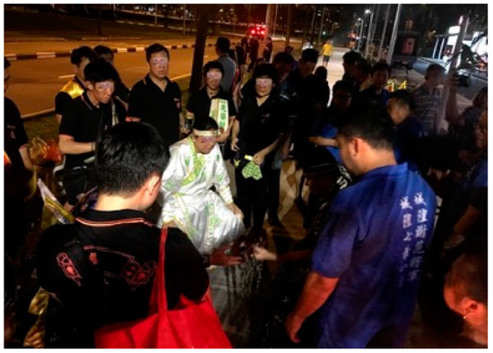 Later that night, the sintua conducted a “yewkeng” (the Hokkien term for 游境), “a procession involving the tangki inspecting the boundaries of his or her territory” (Heng 2017, p. 133), by which “territory” often refers to housing estate the sintua is located within. Walking barefooted around the housing estate, Xie Jiang Jun slung a green wax paper umbrella behind his back, held a paper fan in his left hand, and a wooden tablet painted with the words “城隍謝將軍” in red in his right. A temple assistant used a white wax paper umbrella marked with red wordings to shade Xie Jiang Jun throughout the yewkeng. As this was during the Hungry Ghost Festival, the yewkeng was also done to make offerings to the “hungry ghosts” wandering around the housing estate. At certain locations along the procession—such as under trees along pavements or at grass patches below HDB flats—Xie Jiang Jun would stop and point his fan in a specific direction, signaling his accompanying temple assistants to put together a small set of offerings, comprising red candles, joss sticks, small packets of tea leaves and biscuits, as well as a stack of joss paper (see Figure 2). Devotees would then stand in front of the offerings with joss sticks in hand, paying respects to the wandering spirits in the proximity as the joss paper was set alight. Once, we stopped along a rain canal, when Xie Jiang Jun faced the bottom of the canal and spoke to “something” not visible to the rest of us, and then waved his fan upwards several times, as though gesturing the wandering spirits that we have encountered to come forth and receive their offerings.