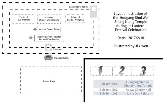 The sub-temple consists of two halls and looks like a small hill from the right side. Only the front building is open to the public. Another building serves as the resting space for the temple committees. Meanwhile, there is a public space around the main gate. The celebration of the Lantern Festival is performed in the open courtyard area between the temple and the opera stage. The nearby stage is built to hold operas during festivals, as is the tradition (See Figure 1).