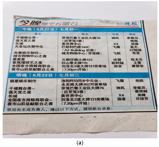 During the whole lunar seventh month, the three major Chinese newspapers in Singapore, which are the Shin Min Daily News (新明日報), the Lianhe Zaobao (聯合早報) and the Lianhe Wanbao (聯合晚報) publish daily announcements providing the details of Getai. The details include the names of the performers, the location, the live band and also the hosts of the Getai. The newspapers welcome the Getai organizers (Taizhu台主) to provide information on their Getai to the newspapers so that they can help spread the news to their readers (Figure 2). Since newspapers did not send journalists to investigate different Getai performances, they had to rely on the reports from the organizers and there might be some Getai performances which were not reported in the newspapers.