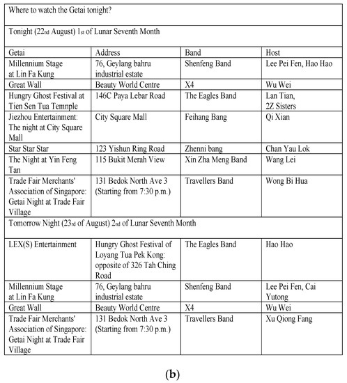 This research also collected data from newspaper archives. The three major Singaporean Chinese-newspapers, the Shin Min Daily News (Shin Min Daily News 2017) (新明日報), the Lianhe Zaobao (Lianhe Zaobao 2017) (聯合早報) and the Lianhe Wanbao (Lianhe Wanbao 2017) (聯合晚報) publish daily announcements providing the details of Getai every lunar seventh month. This paper collected and analyzed all the announcements published in 2017 to illuminate the status of the Hungry Ghost Festival in contemporary Singapore.