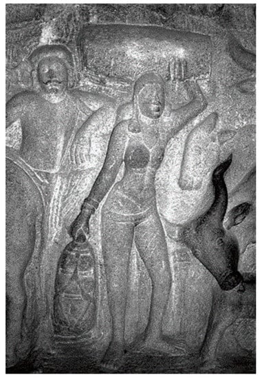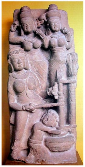 A woman stands on the left, facing the viewer. She is busy churning the contents of a big pot placed at her feet with a rope; below her legs, a kneeling child raising his face towards her and in the direction of the viewer, inserts a hand in the pot. On the Vārānasī fragment, two other women carry pots on their heads in the background; these women may also have been on the Maṇḍor relief (Figure 2), but the space above the churning scene is worn, and the carving is no longer discernible. Today, to the right of the churning scene, cows with their calves fill the space from the bottom to the top of the panel. On the Vārānasī piece, it is possible to see that the churning rope is attached to a tree, whose appearance is the same as the one given on contemporary or slightly later reliefs of the arjuna trees between which Kṛṣṇa crawls in the episode with the mortar.