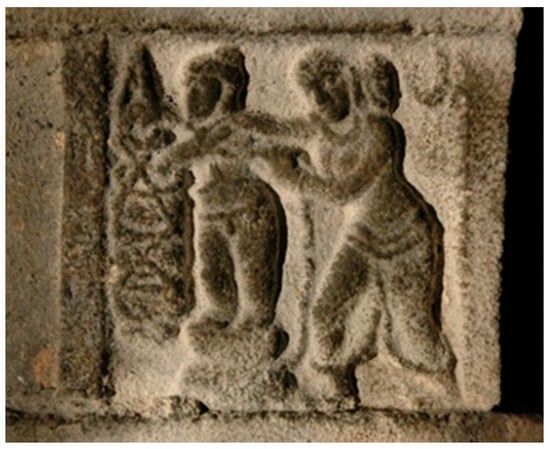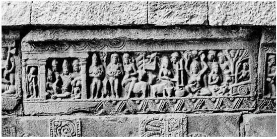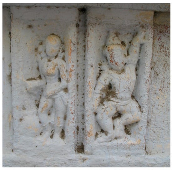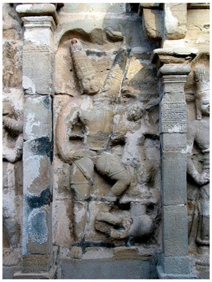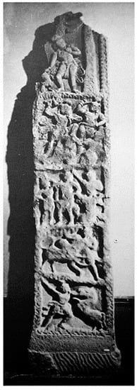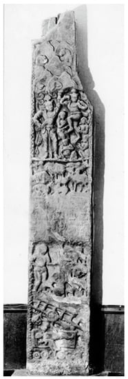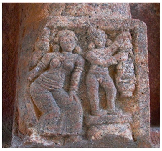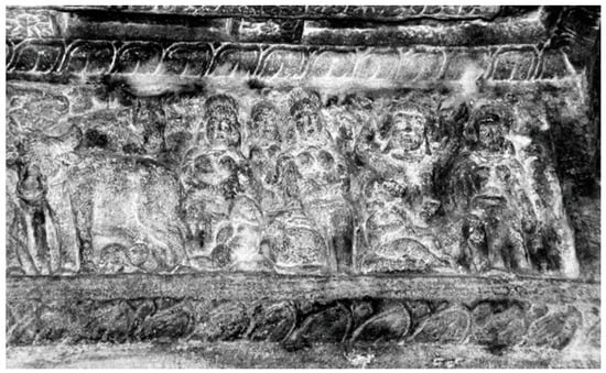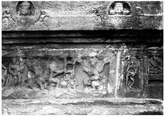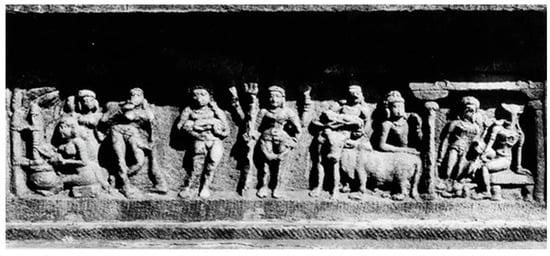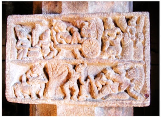 All the episodes from the childhood of Kṛṣṇa in the reliefs from Maṇḍor and the northern Gangetic plain of the fourth–sixth century and from sites in Karnataka of the late-sixth century correspond to one passage of the Harivaṃśa. For the period of time to which these carvings have been assigned, we have seen they are already rather numerous. In Karnataka, the Slaying of Pūtanā relates to different scenes than at Maṇḍor and Deogarh in Madhya Pradesh (Figure 5), where the Pūtanā episode is conflated with that of the cart. There, Kṛṣna is depicted lying on the cart when Pūtanā comes as a woman who becomes a bird that Kṛṣṇa strangles (Figure 5), or Pūtanā comes as a bird and becomes a woman whose breasts Kṛṣṇa sucks (Maṇḍor, Figure 4), as is told in the Harivaṃśa. At Paṭṭadakal, on the other hand, three discrete episodes are represented: The cart, a combat against a bird very different from the crow (śakunī) that is the form of Pūtanā in the Harivaṃśa and the earlier representations, and an ogress whose breasts Kṛṣṇa sucks. In fact, the episode of Pūtanā has been expanded there. Following the accounts composed in North Indian languages and the corresponding carvings, J. Hawley () has demonstrated how the story of the Harivaṃśa has been split into two in the Bhāgavata-purāṇa. In a previous publication, we have elaborated on the “shadow-motifs” that show how Tamil texts and stone representations of the far South are the missing link of the story ().