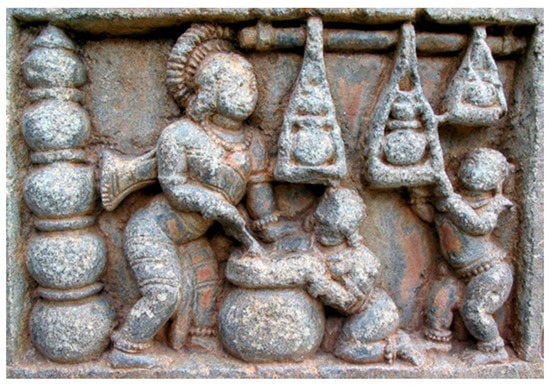 | 24 | The churning of butter is depicted before the Pūtanā episode according to the order of events that seems the more logical if we follow the texts. To the other side of the churning of butter is the exchange of babies or another scene alluding to the arrival of Kṛṣṇa to the cowherd village (Figure 6, Figure 7, Figure 8 and Figure 9); in Figure 10 events are presented in an exploded perspective, but Pūtanā has been depicted just before or after the churning.  |